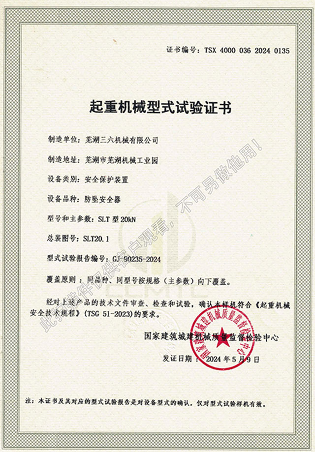 SLT型20kN防墜器型式試驗(yàn)證書